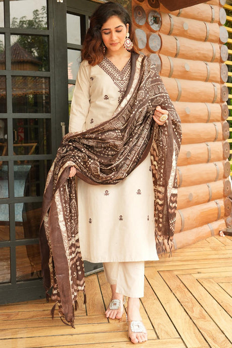 Cream Floral Embroidered Khadi Straight Cut Suit (VT-2519)