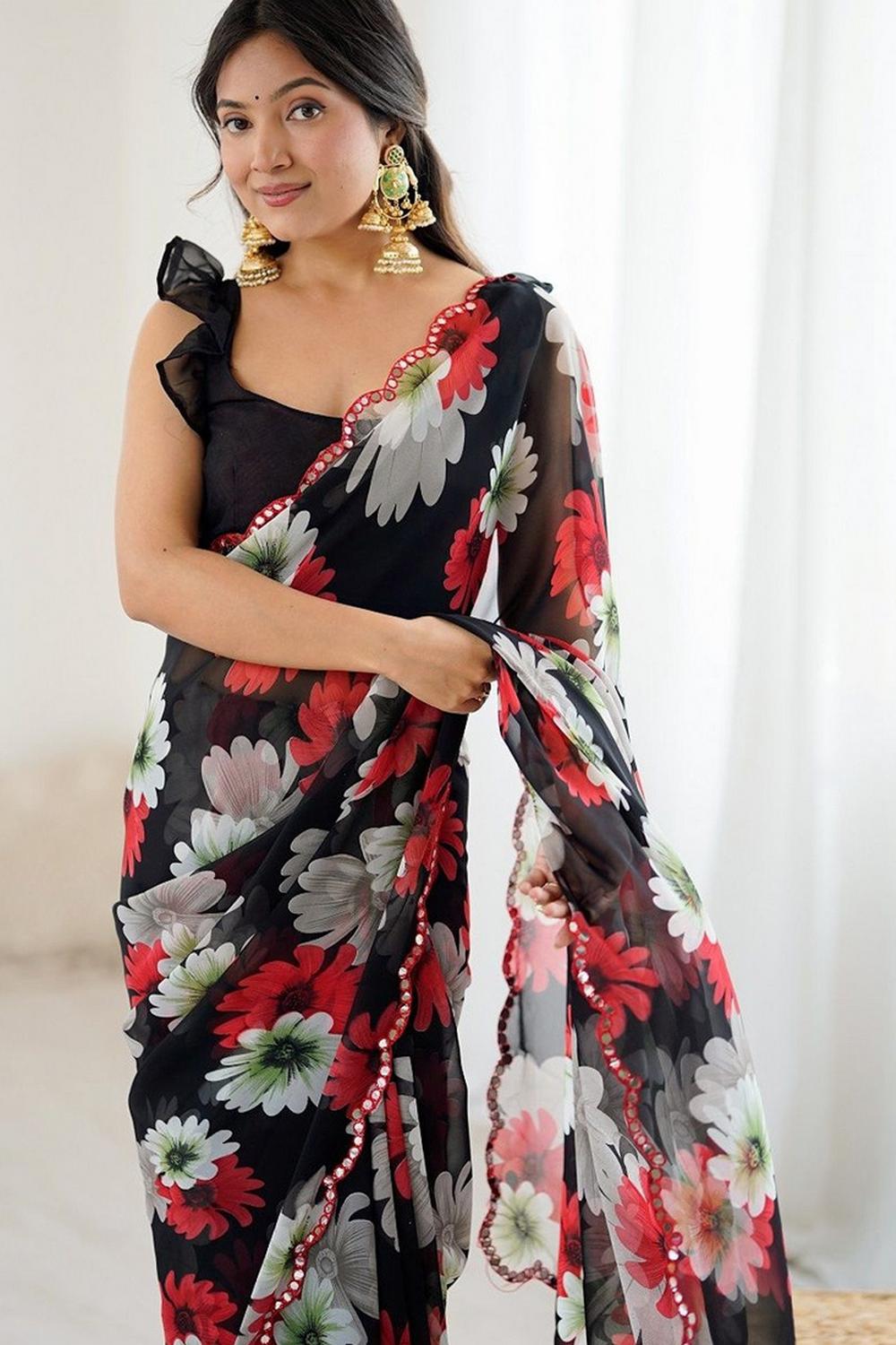 Elevate your wardrobe with our exquisite Saree a masterpiece crafted to add timeless elegance to your style. Made from Georgette this saree offers a perfect mix of comfort and sophistication. Adorned with Floral Printed it showcases intricate craftsmanship that speaks volumes of tradition and artistry. Perfect for Party this saree is a versatile addition to your collection, ensuring you stand out effortlessly. Pair it with elegant Jewelry, for a glamorous look. Add Clutches or Potli Bags and complete the ensemble with Wedges & Heels , making it a perfect choice for any event. Make a statement and embrace the elegance of Saree today