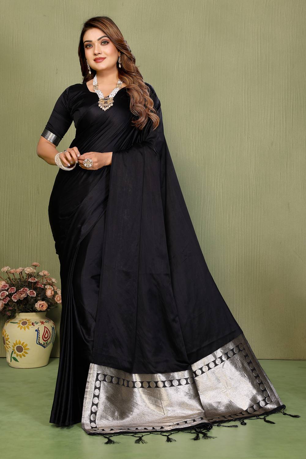Black Satin Woven Saree
