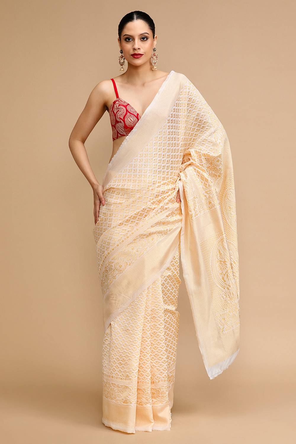 Elevate your wardrobe with our exquisite Saree a masterpiece crafted to add timeless elegance to your style. Made from Lichi Silk this saree offers a perfect mix of comfort and sophistication. Adorned with Woven it showcases intricate craftsmanship that speaks volumes of tradition and artistry. Perfect for Festive this saree is a versatile addition to your collection, ensuring you stand out effortlessly. Pair it with elegant Jewelry, such as [for a glamorous look. Add Clutches or Potli Bags and complete the ensemble with Wedges & Heels , making it a perfect choice for any event. Make a statement and embrace the elegance of Saree today