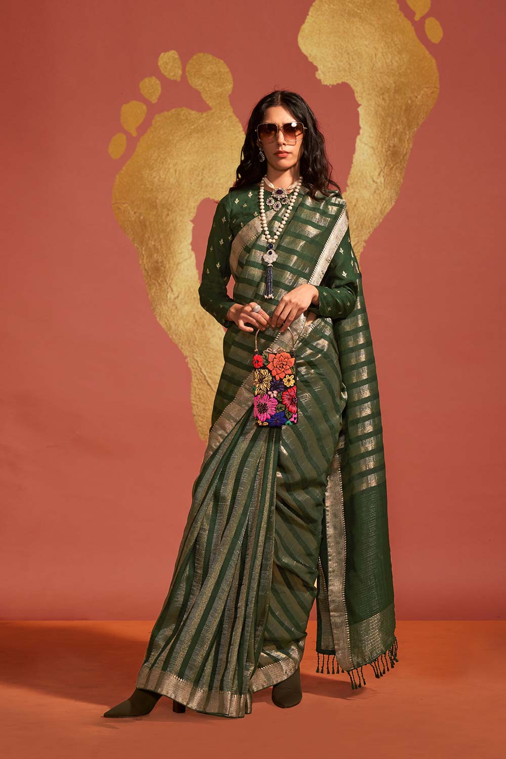The saree is made from viscose, a semi-synthetic fiber celebrated for its smooth, silky feel and excellent drape. The base color is green.