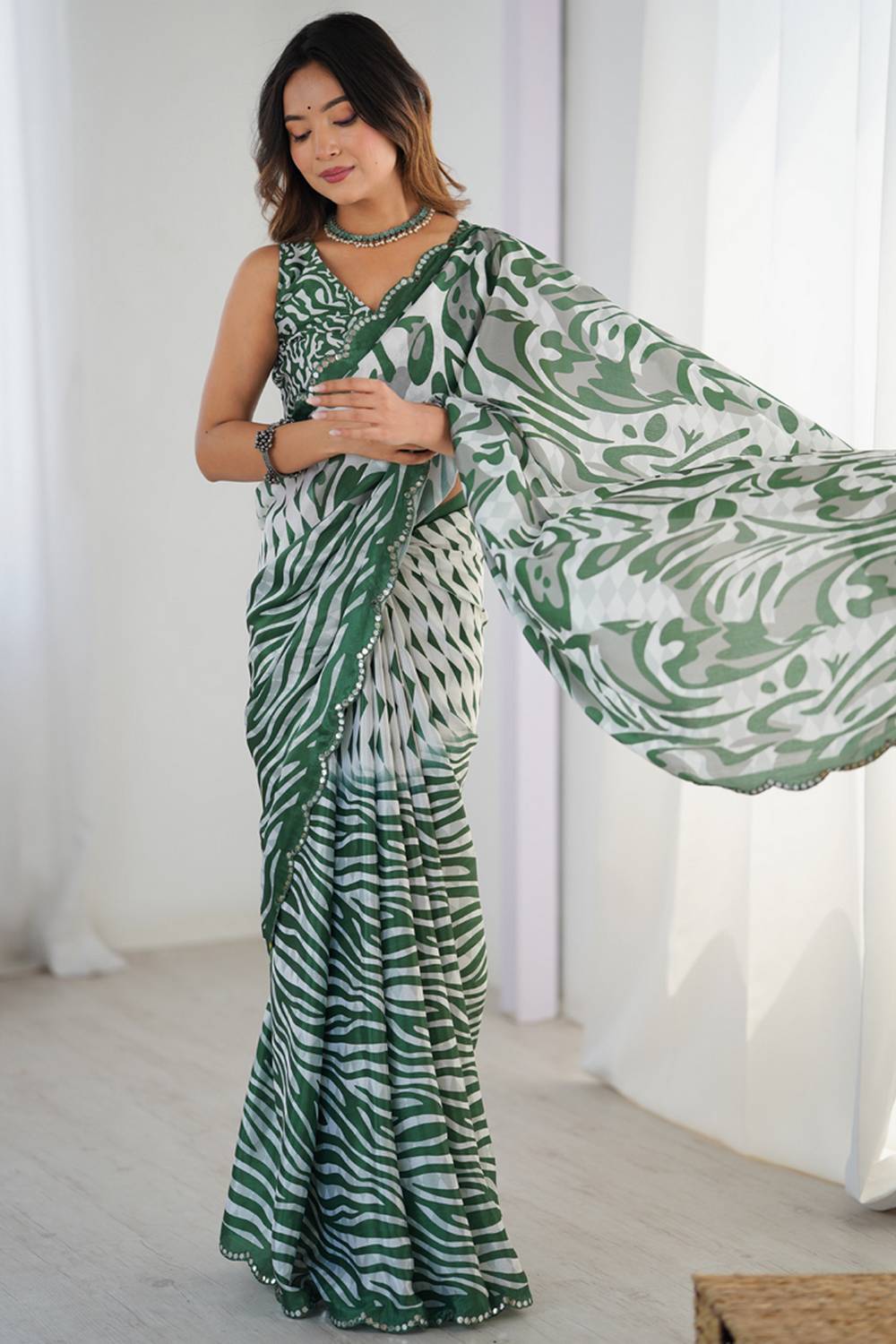Elevate your wardrobe with our exquisite Saree a masterpiece crafted to add timeless elegance to your style. Made from Art Silk this saree offers a perfect mix of comfort and sophistication. Adorned with Printed it showcases intricate craftsmanship that speaks volumes of tradition and artistry. Perfect for Party this saree is a versatile addition to your collection, ensuring you stand out effortlessly. Pair it with elegant Jewelry, for a glamorous look. Add Clutches or Potli Bags and complete the ensemble with Wedges & Heels , making it a perfect choice for any event. Make a statement and embrace the elegance of Saree today