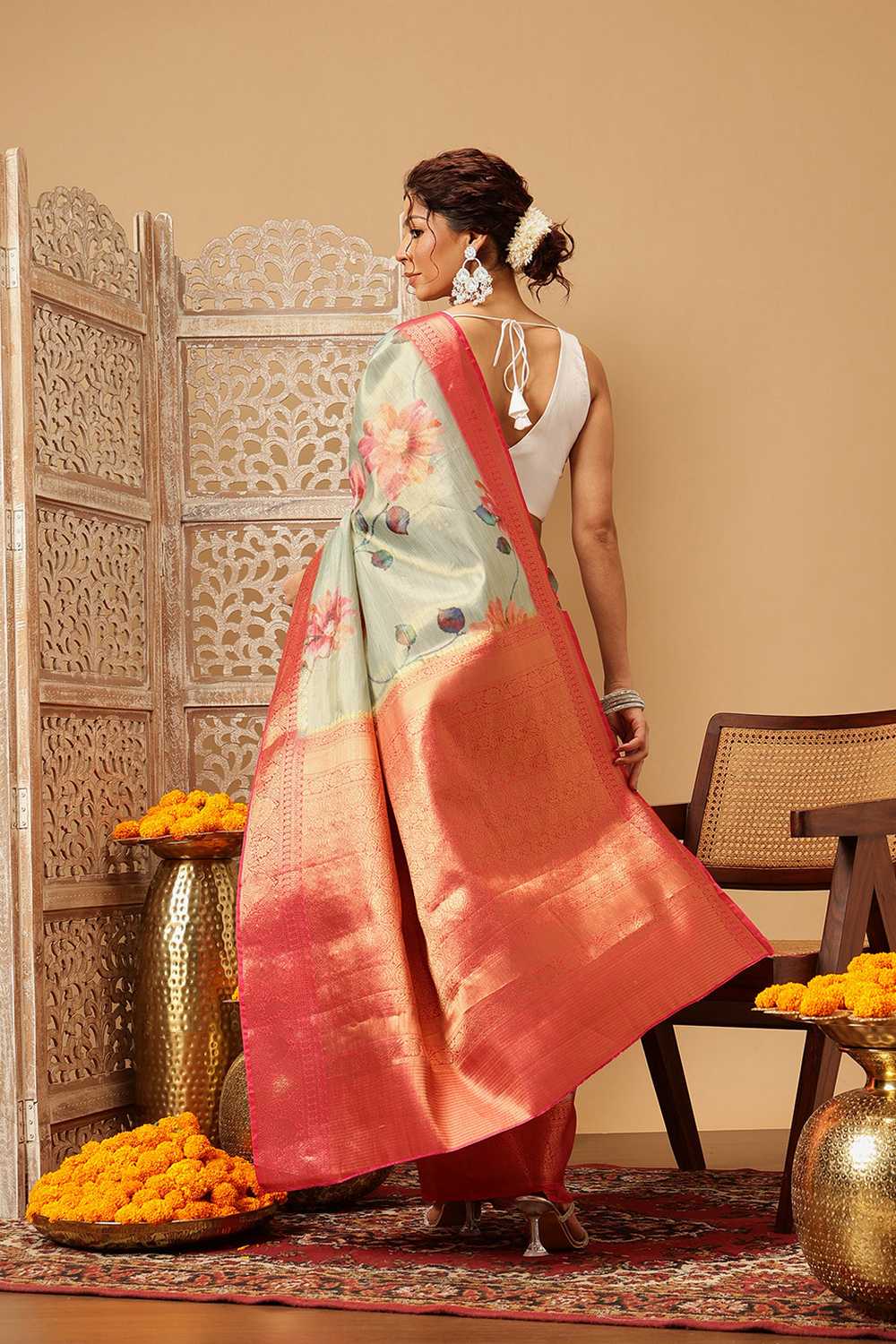 Elevate your wardrobe with our exquisite Saree a masterpiece crafted to add timeless elegance to your style. Made from Tissue Silk this saree offers a perfect mix of comfort and sophistication. Adorned with Floral Printed it showcases intricate craftsmanship that speaks volumes of tradition and artistry. Perfect for Festive this saree is a versatile addition to your collection, ensuring you stand out effortlessly. Pair it with elegant Jewelry, for a glamorous look. Add Clutches or,potli Bags and complete the ensemble with Wedges & Heels making it a perfect choice for any event. Make a statement and embrace the elegance of Saree today