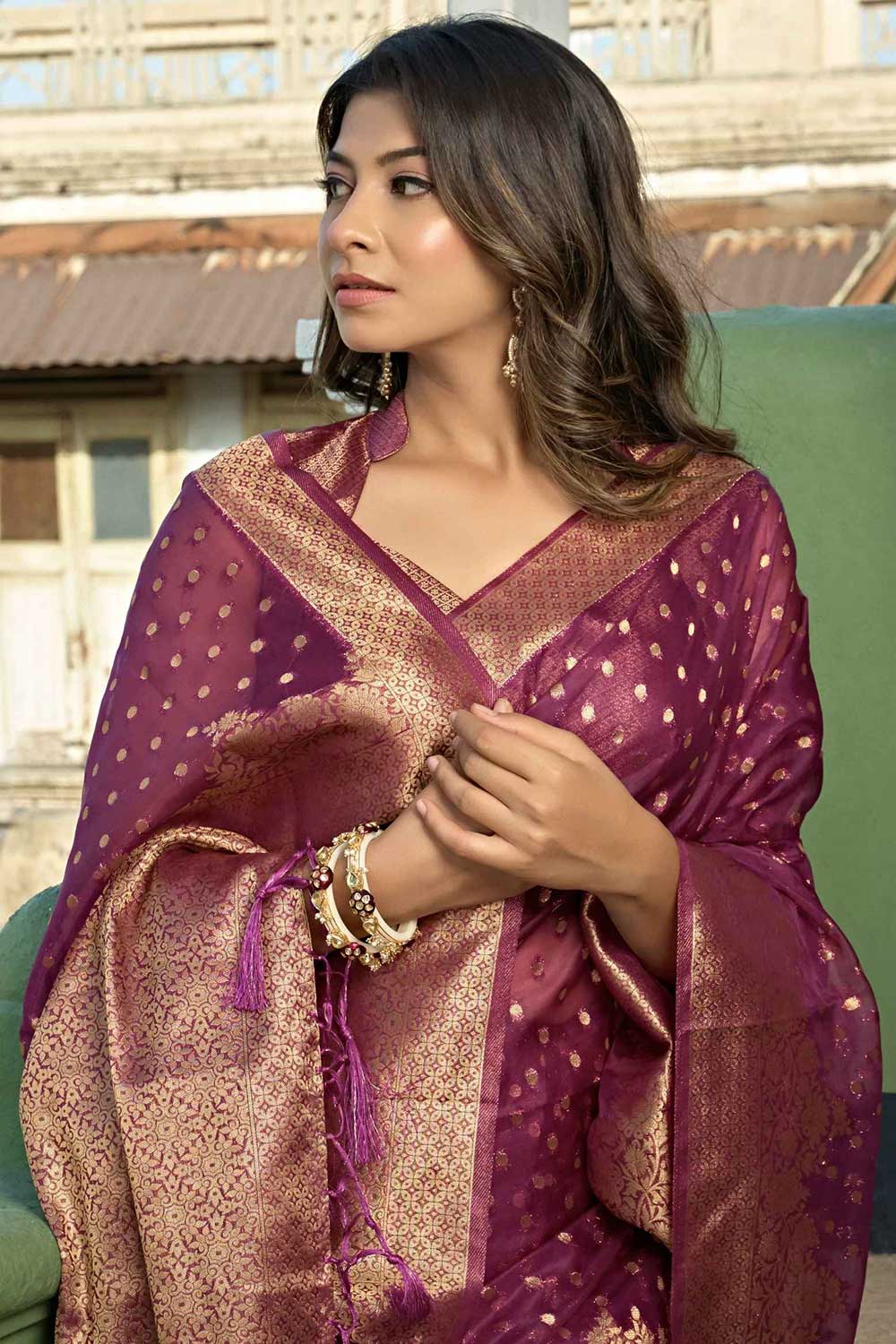 Wine Organza Zari Saree