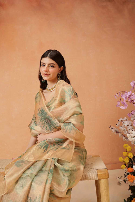 Brown Floral Printed Organza Saree