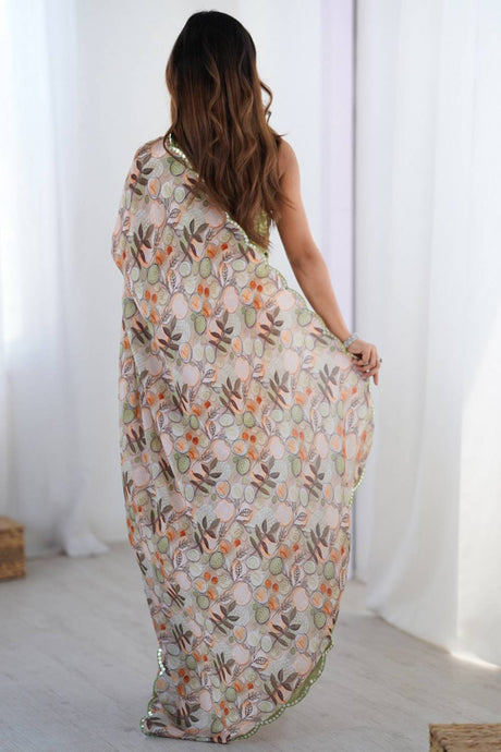 Off White Floral Printed Art Silk Saree