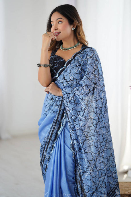 Blue Floral Printed Art Silk Saree