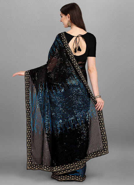 Blue Burfi Silk Saree With Lycra Sequins Unstitch Blouse