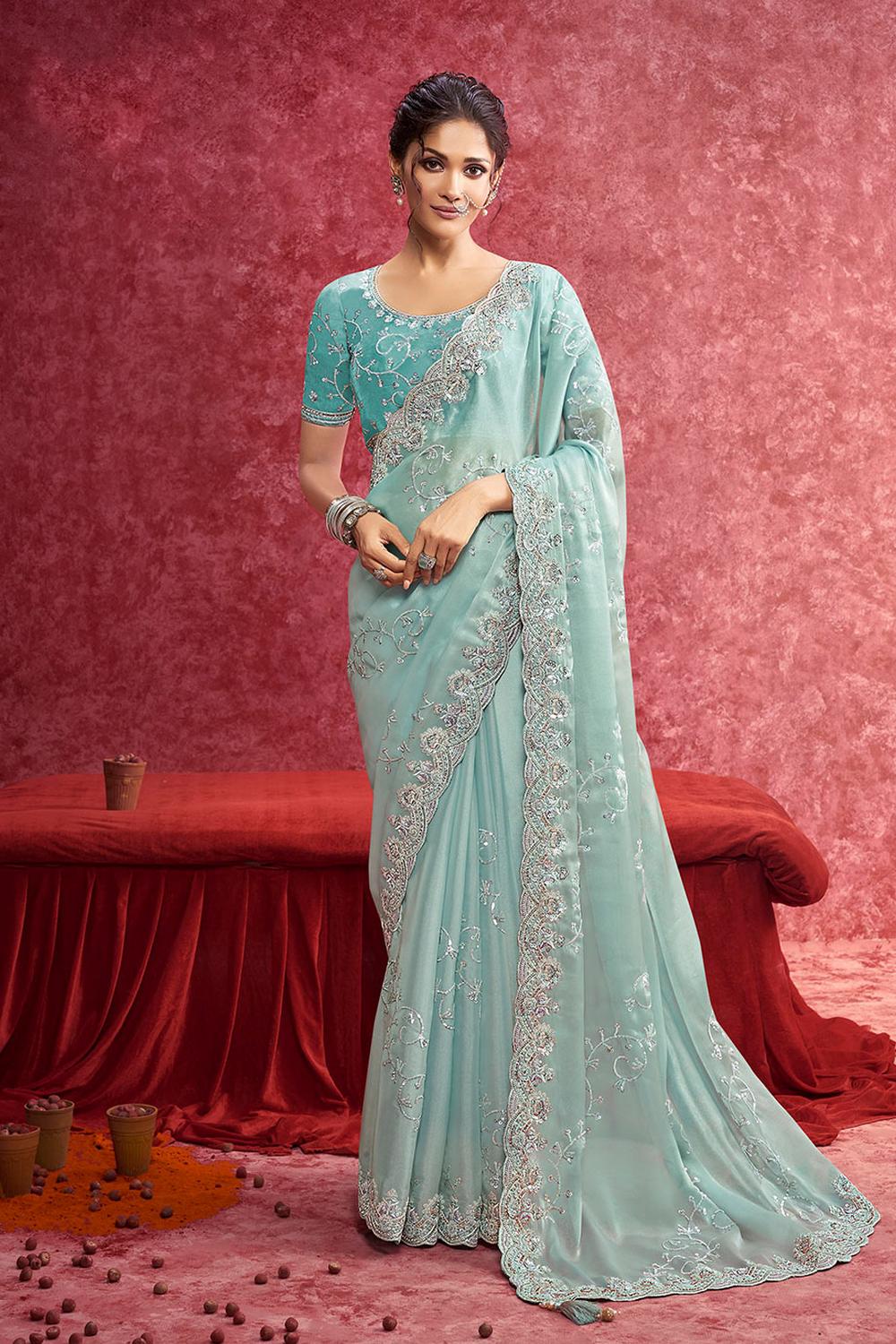 Blue Sequin with Embroidered Net Saree