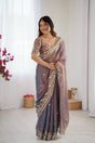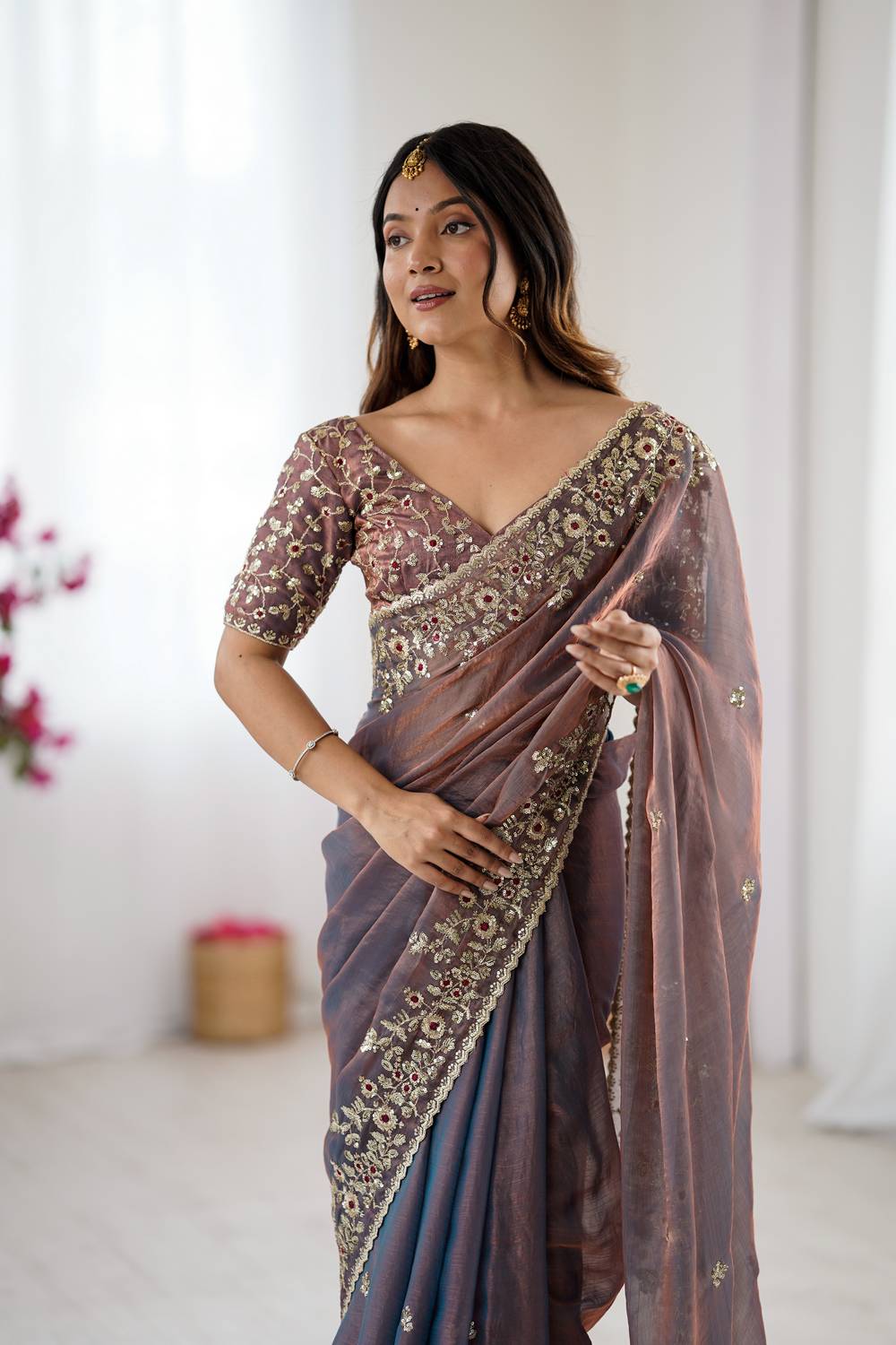 Elevate your wardrobe with our exquisite Saree a masterpiece crafted to add timeless elegance to your style. Made from Chiffon this saree offers a perfect mix of comfort and sophistication. Adorned with Sequin with Embroidered it showcases intricate craftsmanship that speaks volumes of tradition and artistry. Perfect for Party, Sangeet, Mehendi this saree is a versatile addition to your collection, ensuring you stand out effortlessly. Pair it with elegant Jewelry, for a glamorous look. Add Clutches or Potli Bags and complete the ensemble with Wedges & Heels , making it a perfect choice for any event. Make a statement and embrace the elegance of Saree today