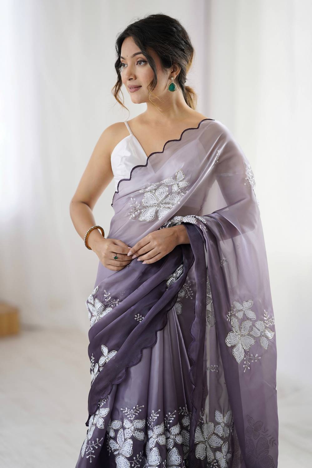 Elevate your wardrobe with our exquisite Saree a masterpiece crafted to add timeless elegance to your style. Made from Satin this saree offers a perfect mix of comfort and sophistication. Adorned with Sequin with Embroidered it showcases intricate craftsmanship that speaks volumes of tradition and artistry. Perfect for Party, Sangeet, Mehendi this saree is a versatile addition to your collection, ensuring you stand out effortlessly. Pair it with elegant Jewelry, for a glamorous look. Add Clutches or Potli Bags and complete the ensemble with Wedges & Heels , making it a perfect choice for any event. Make a statement and embrace the elegance of Saree today