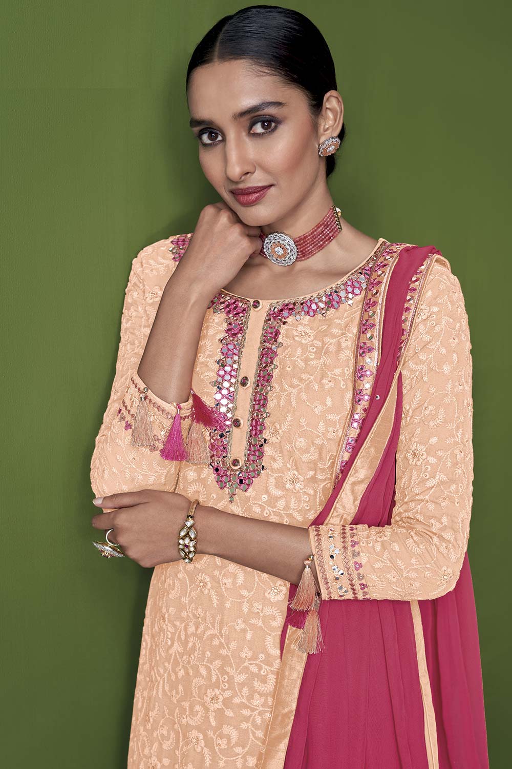Peach Faux Georgette Mirror And Embroidery Work Sharara Set