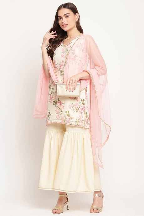 Women Beige Crepe Digital Floral Print Sharara Suit Set With Dupatta