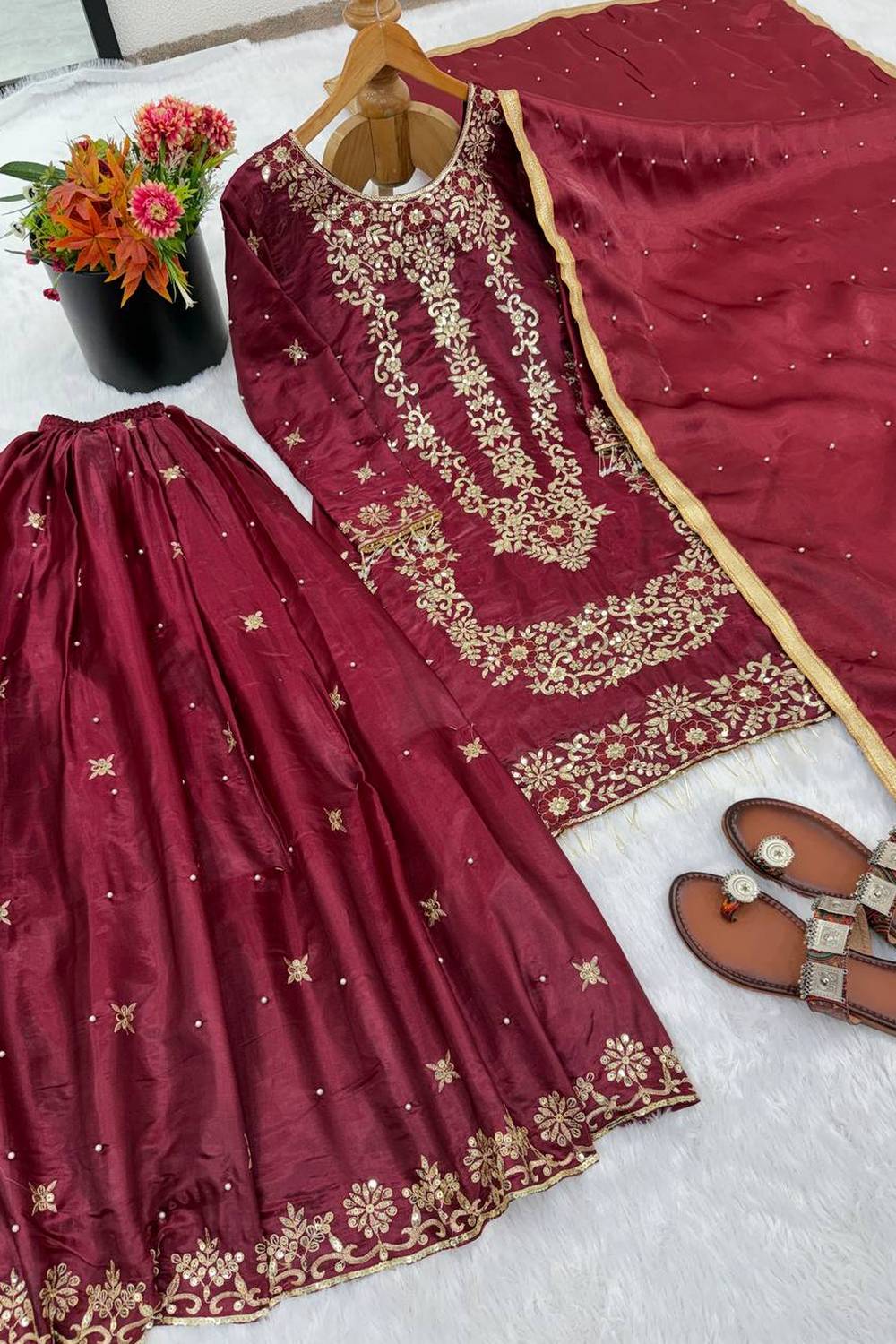 Maroon Sequin with Embroidered Silk Sharara Suits