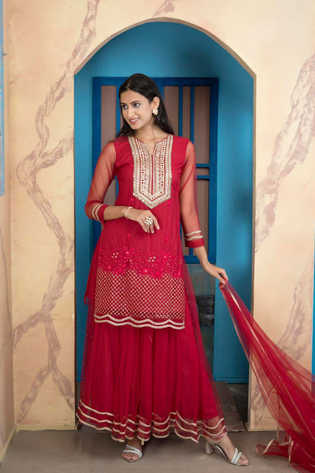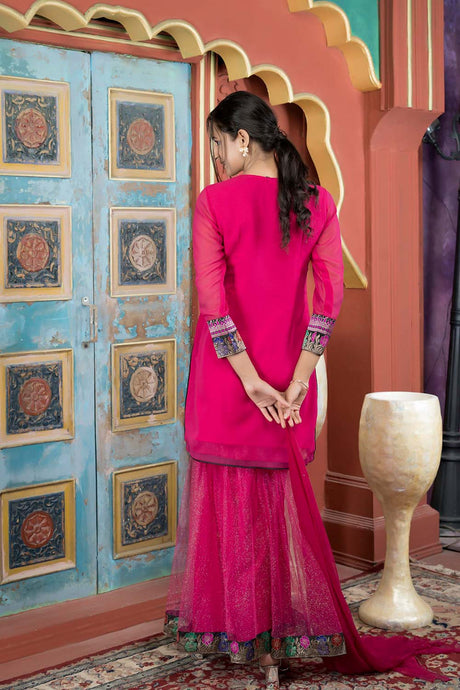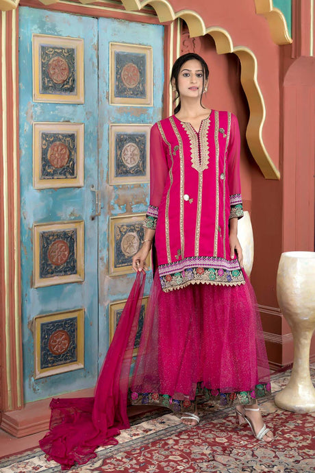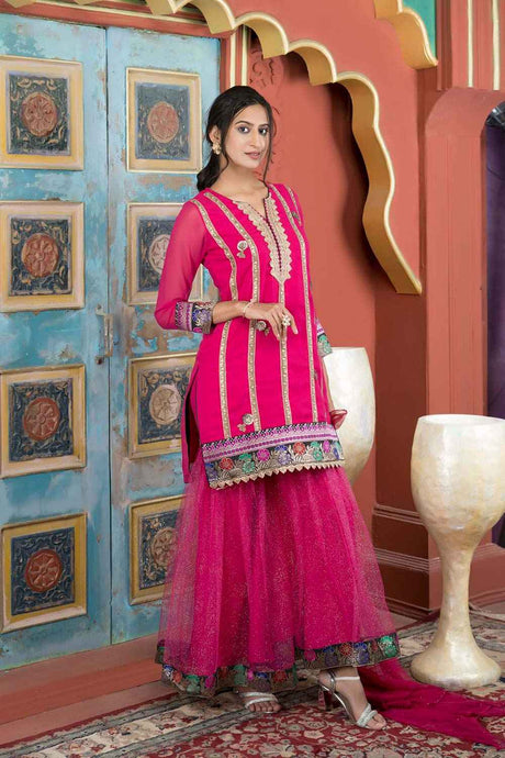 Pink Embroidered Net Straight Cut Sharara Suit Set