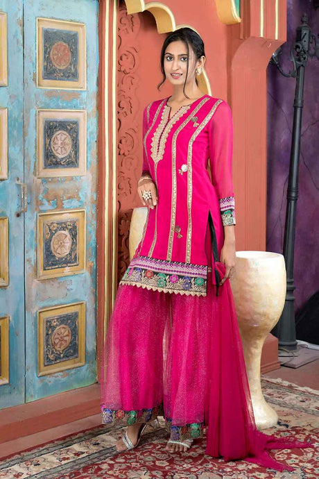 Pink Embroidered Georgette Straight Cut Sharara Suit Set