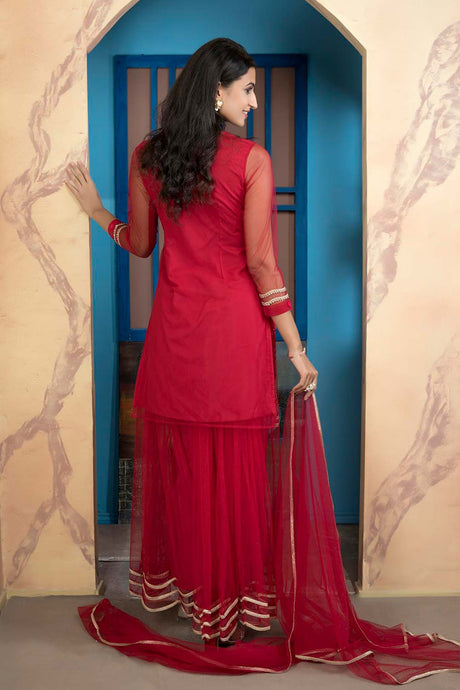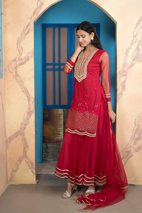 Maroon Silk Blend Embroidered Straight Sharara Suit Set