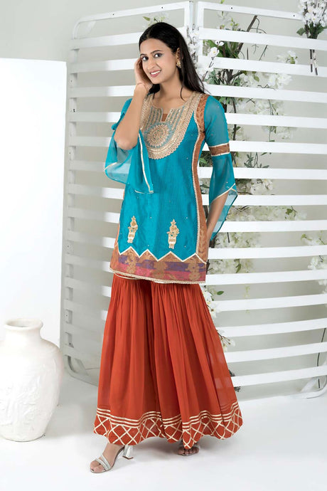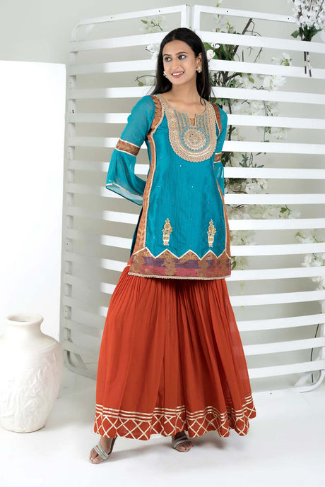 Blue Embroidered Art Silk Straight Cut Sharara Suit Set