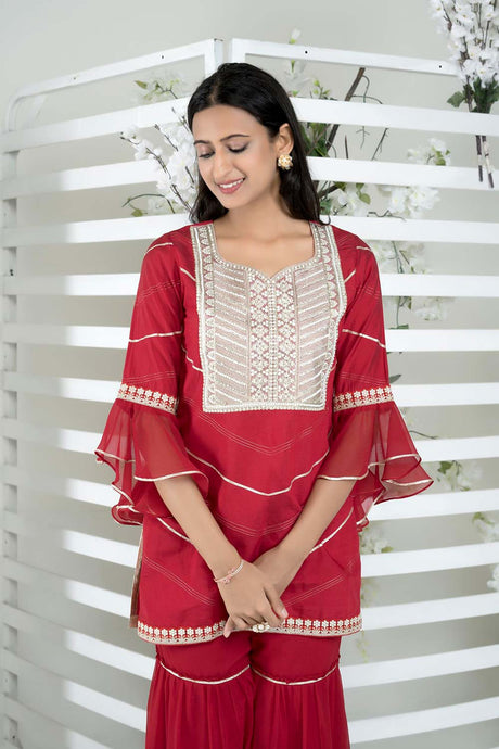 Maroon Embroidered Cotton Straight Cut Sharara Suit Set