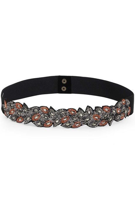 Botanical Sequins Cut Work Waist Belt In Black & Silver & Rust