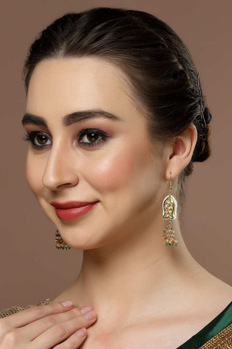Green And Gold Gold-Plated Kundan And Pearls Jhumka Dangling