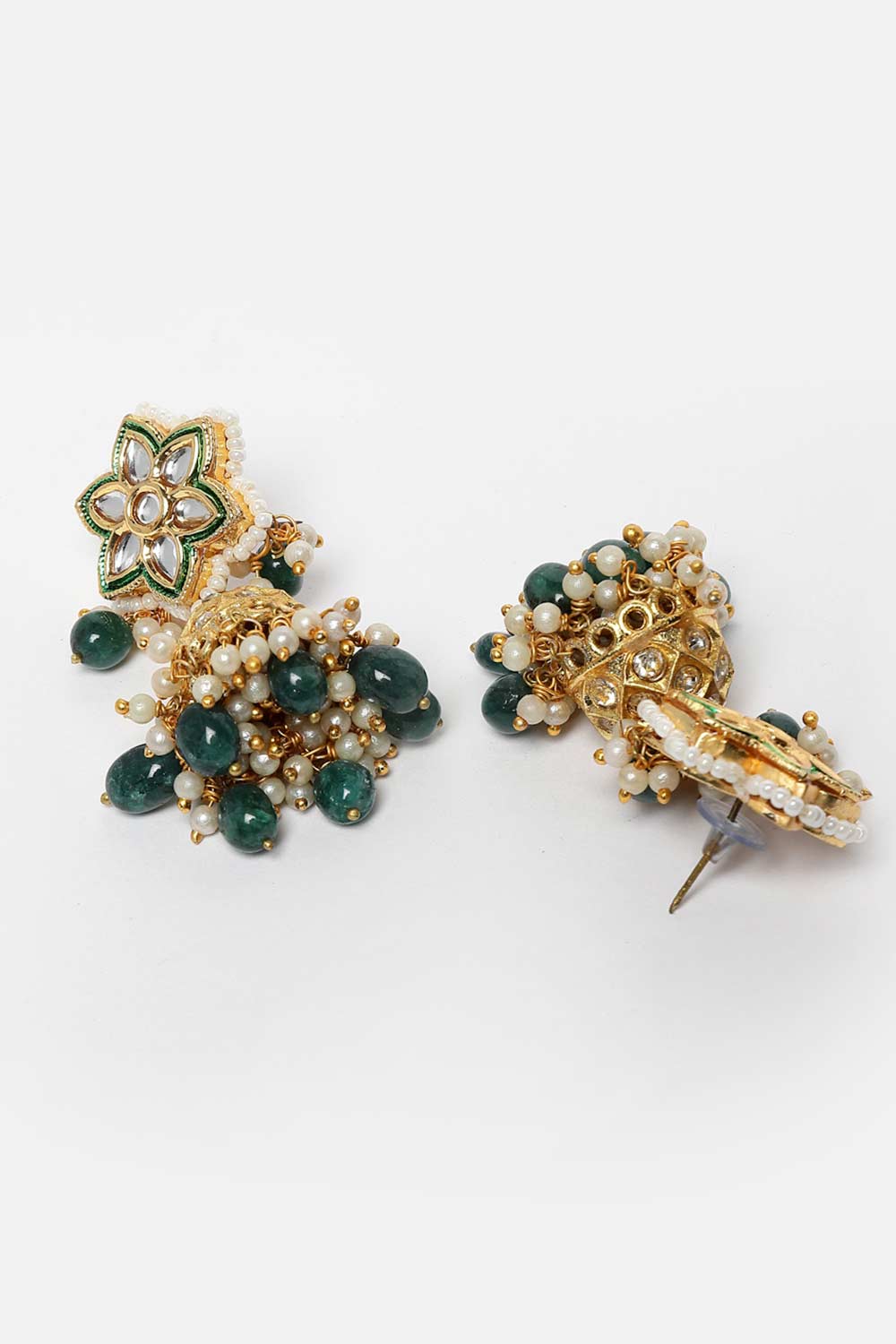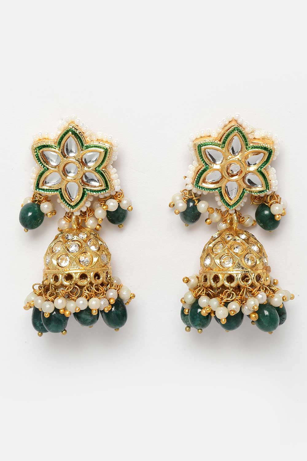 Green & Gold Jhumkas Earring With Kundan & American Diamonds