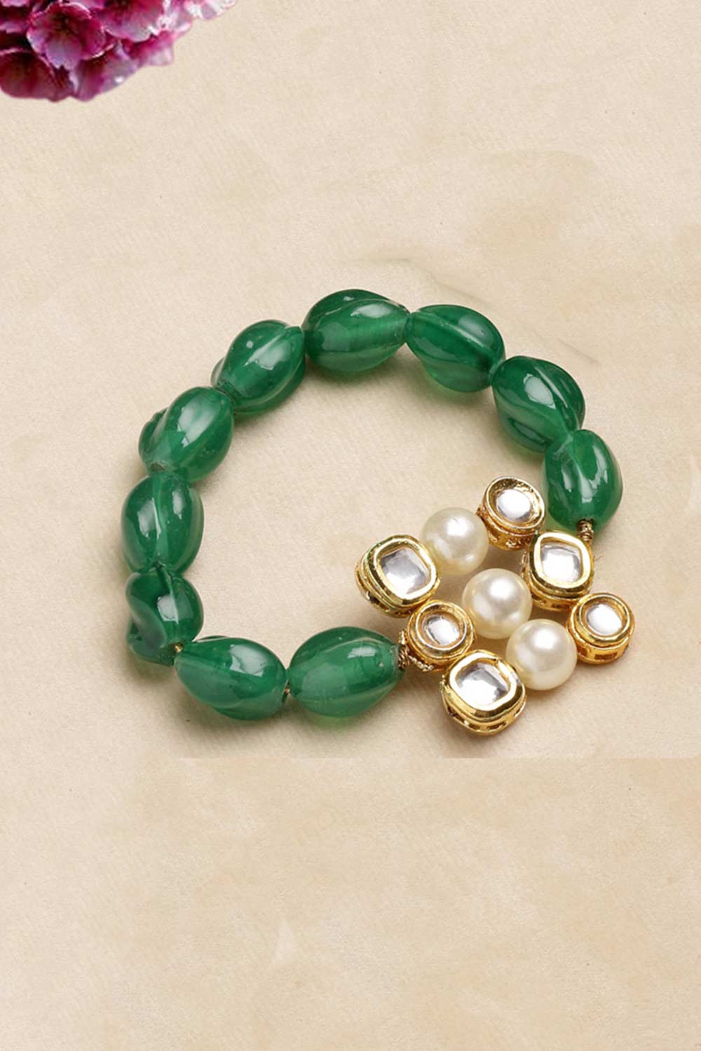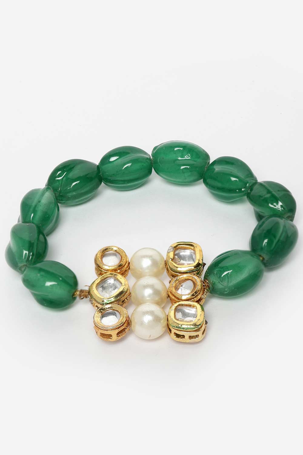 Green & Gold Elasticated Bracelet With Kundan & Pearls