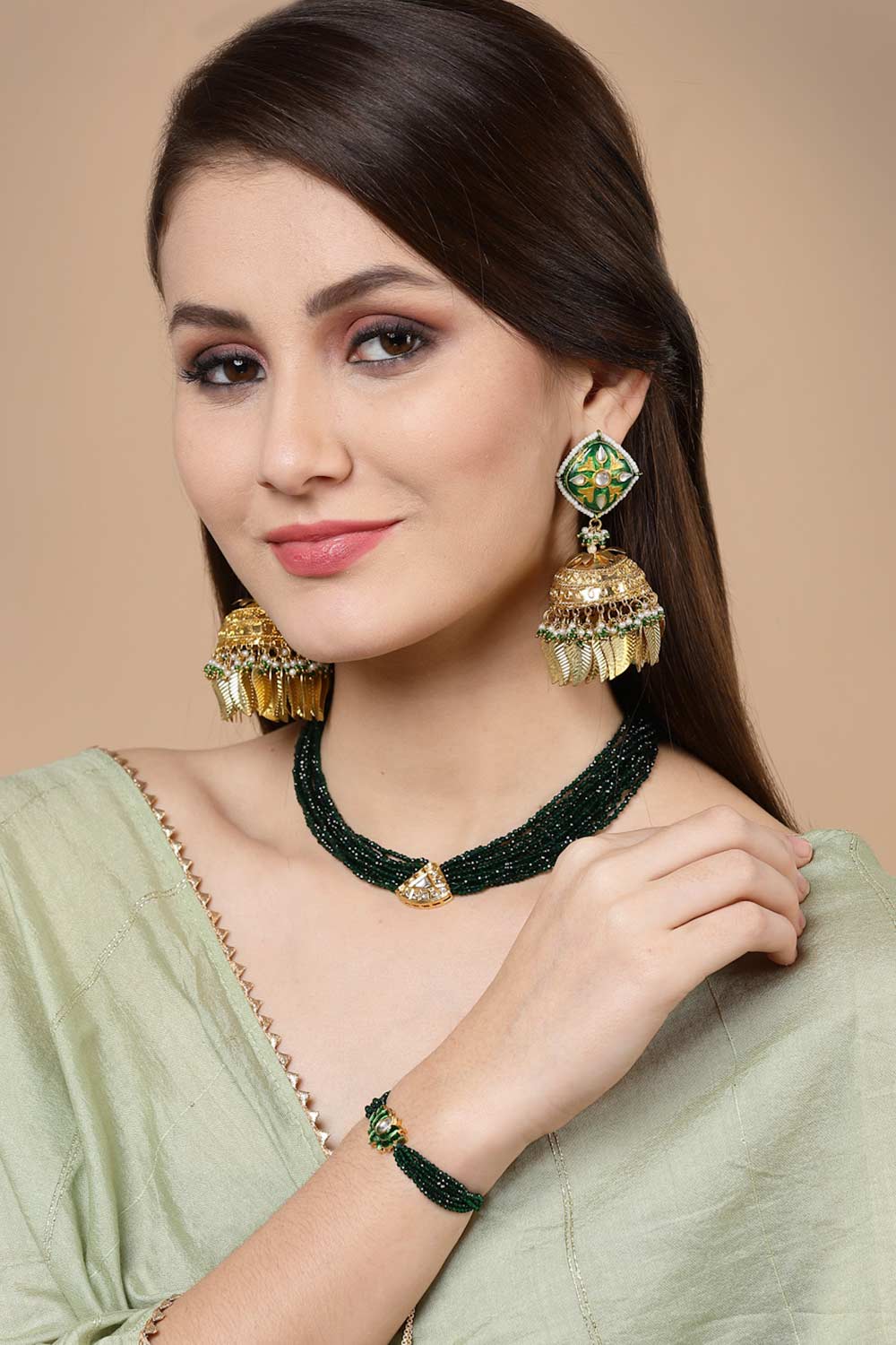 Green And Gold Gold-Plated Kundan And Pearls Bracelet