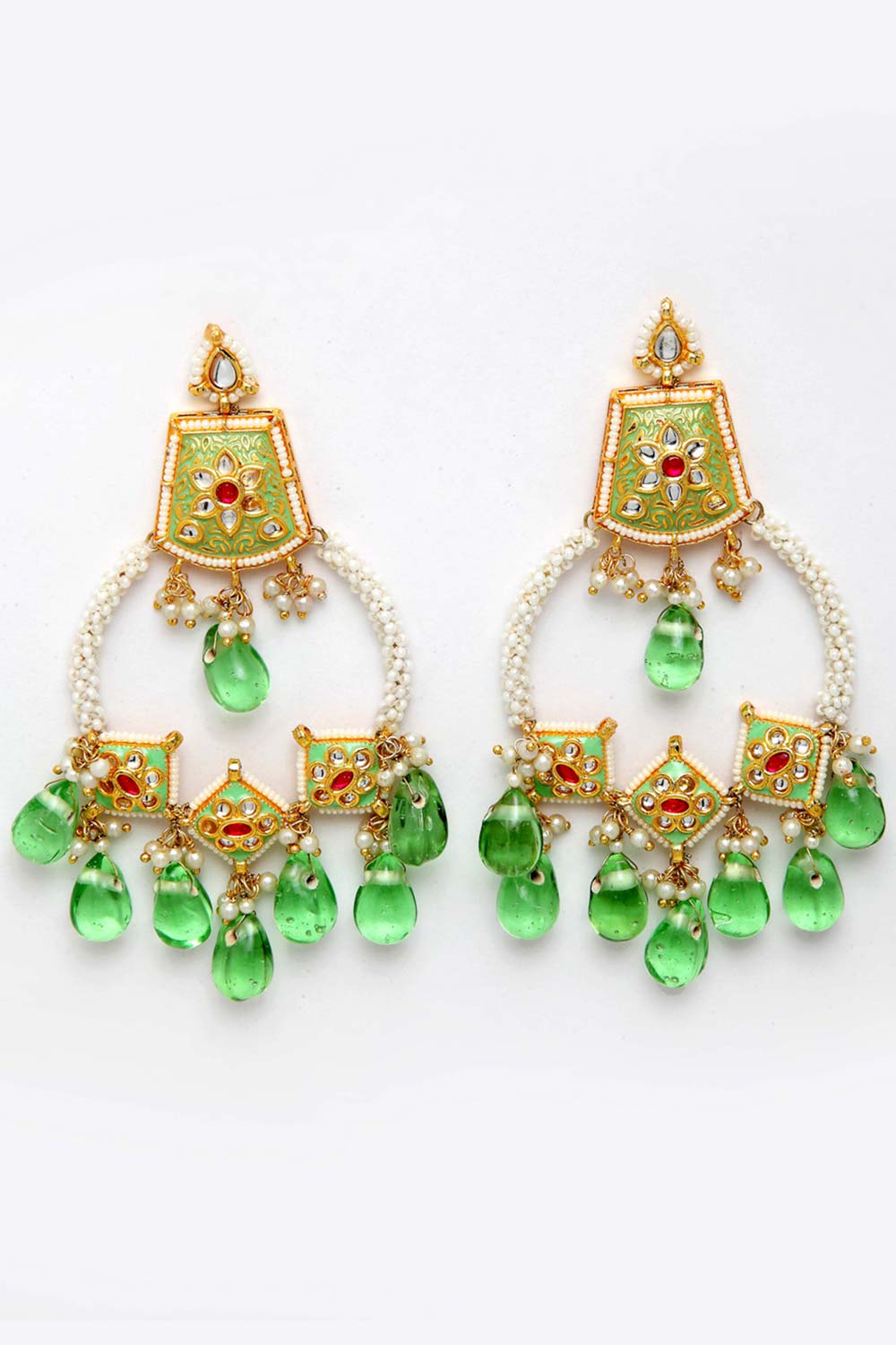 Green And White Gold-Plated Kundan And Pearls Chandbali Earring