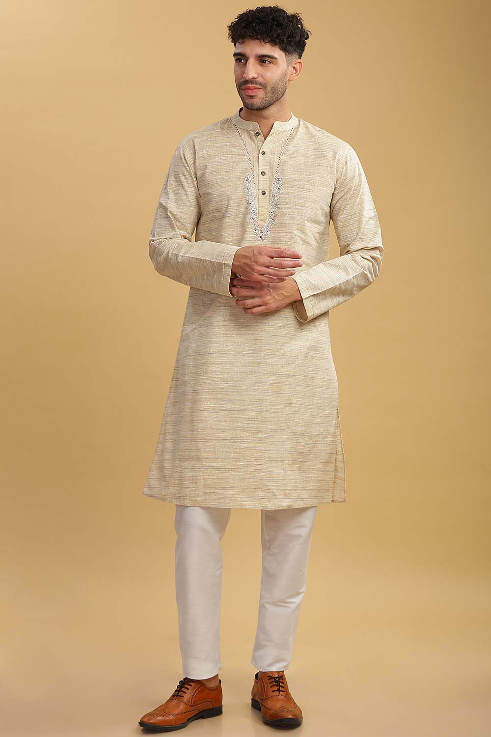 Men's Beige Poly Cotton Mandarin Collar Long Kurta