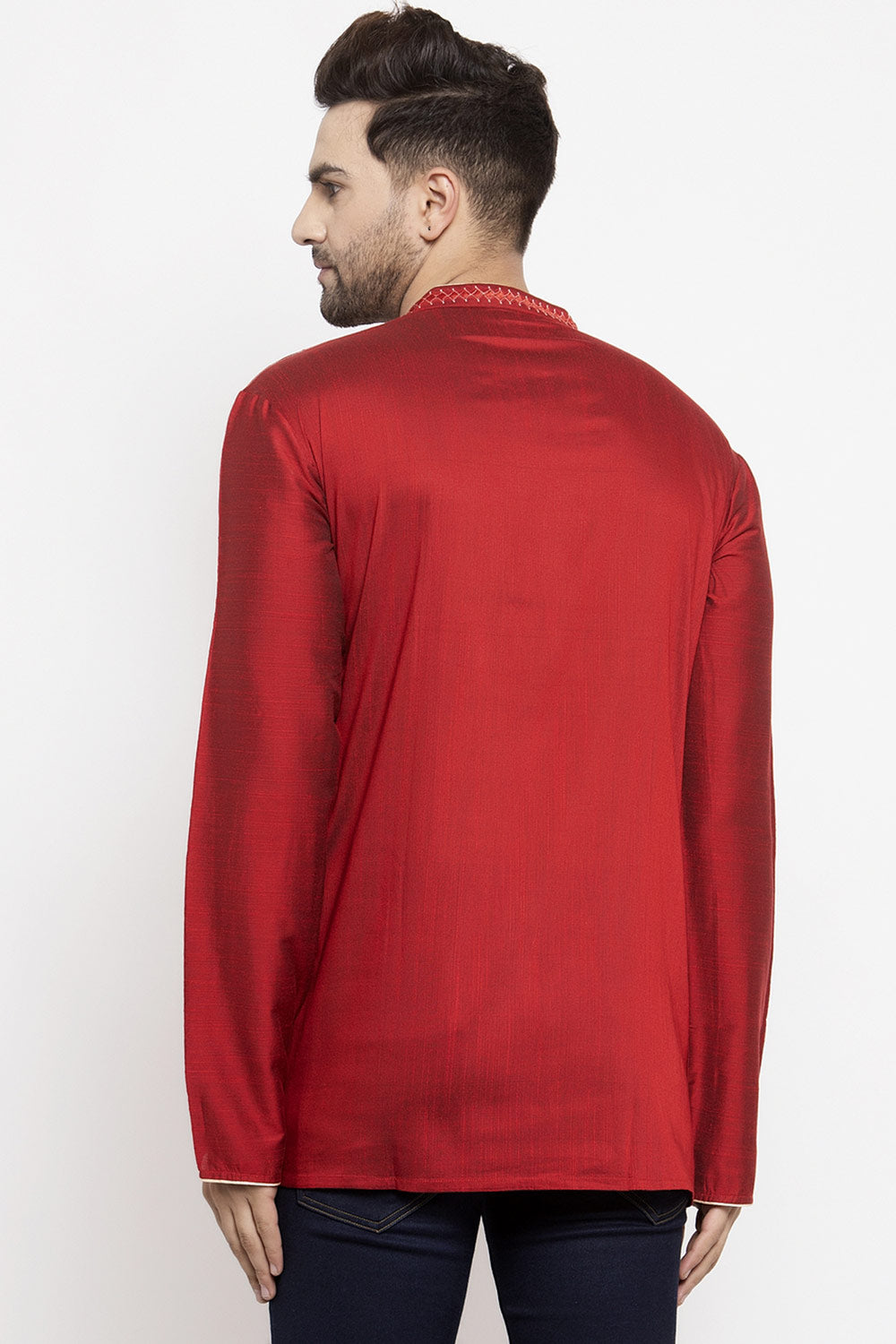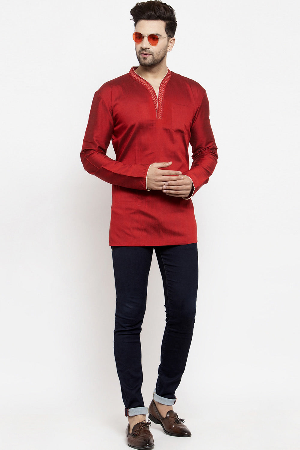 Men's Cotton Art Silk Embroidery Short Kurta Top In Red