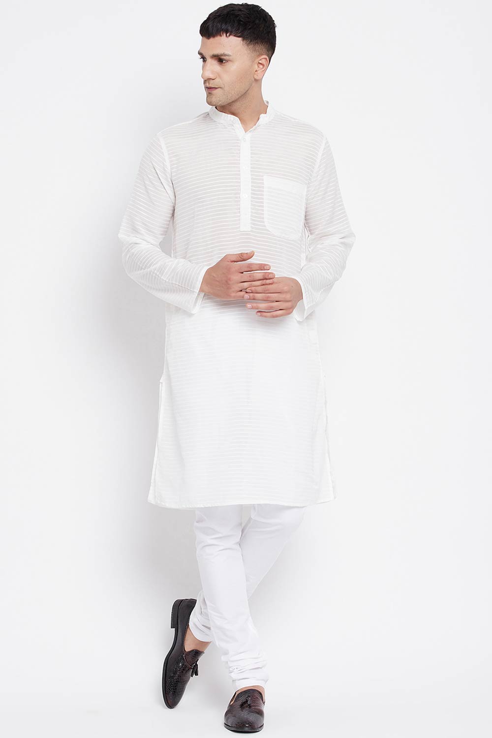 Men's Pure Cotton Stripe Print Sherwani Top Kurta Top In Light White