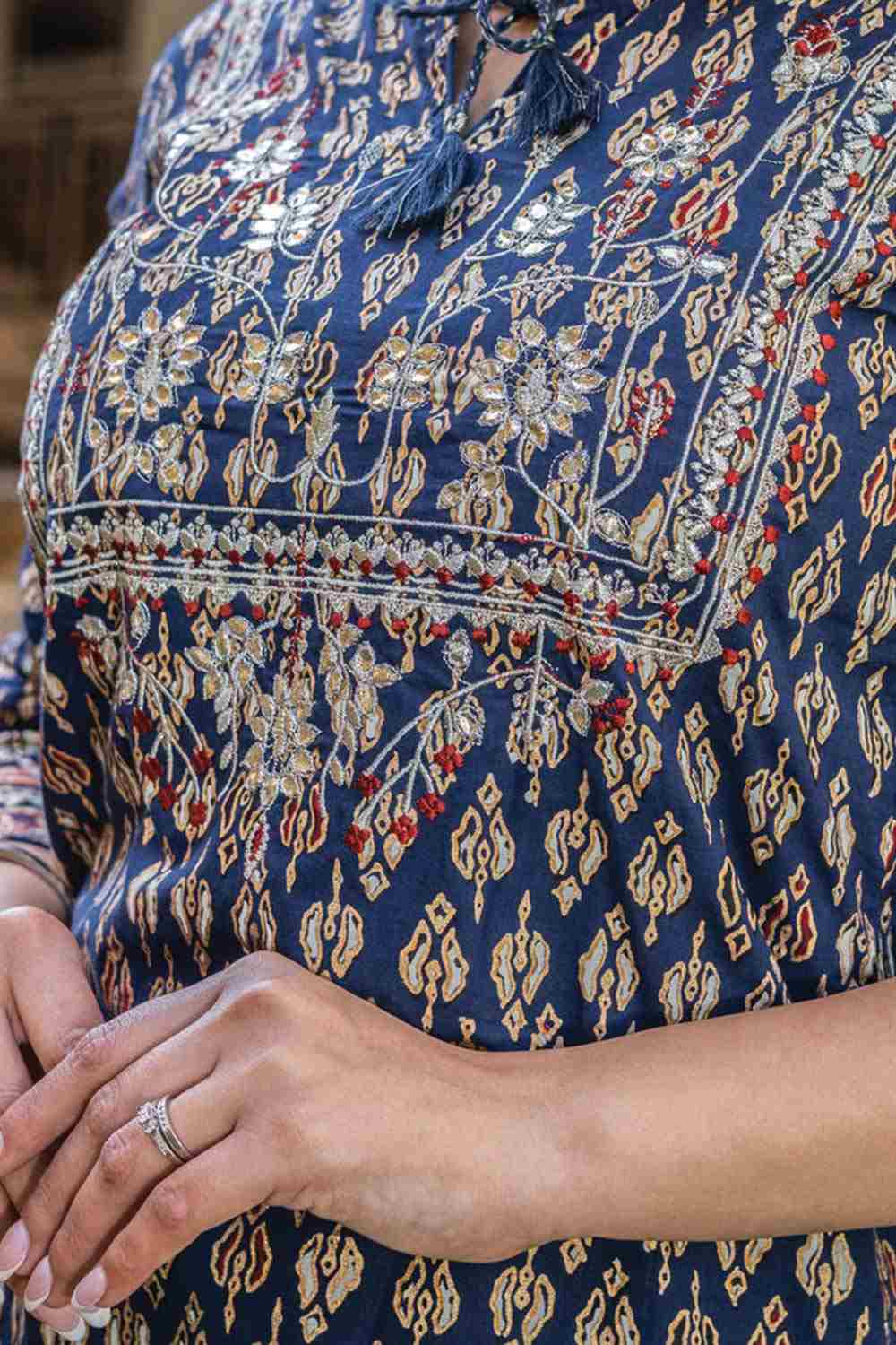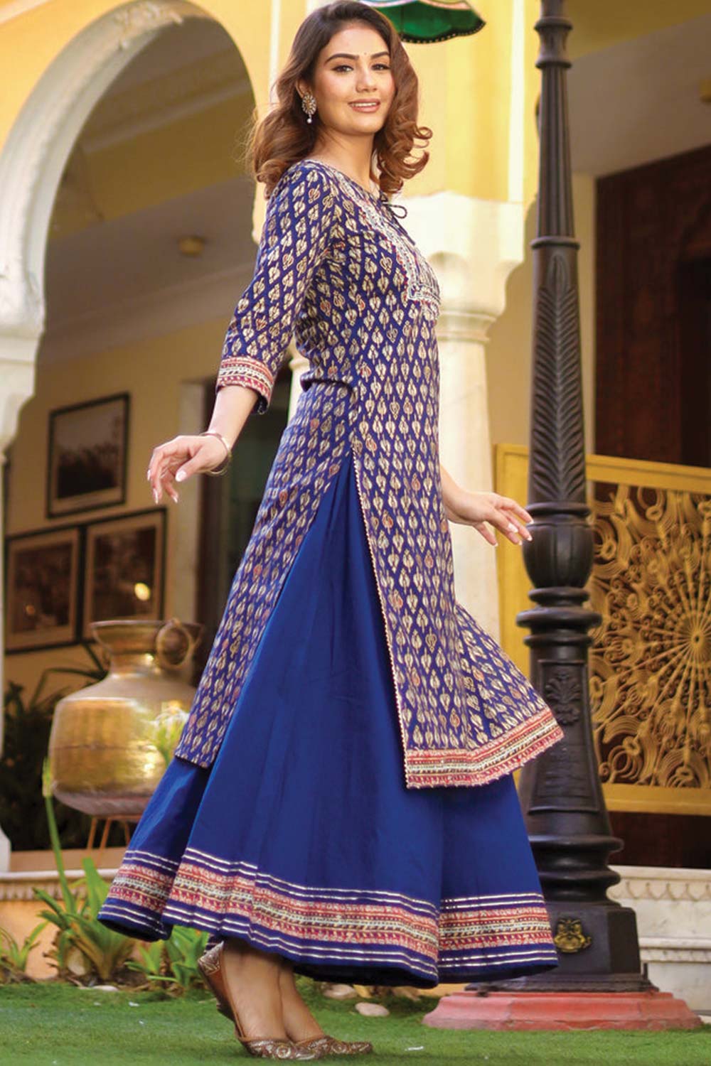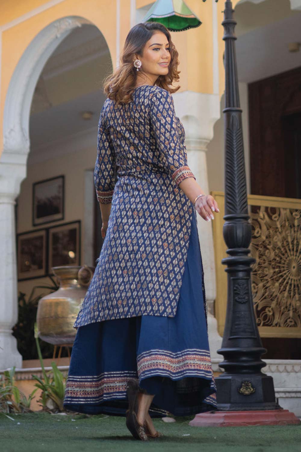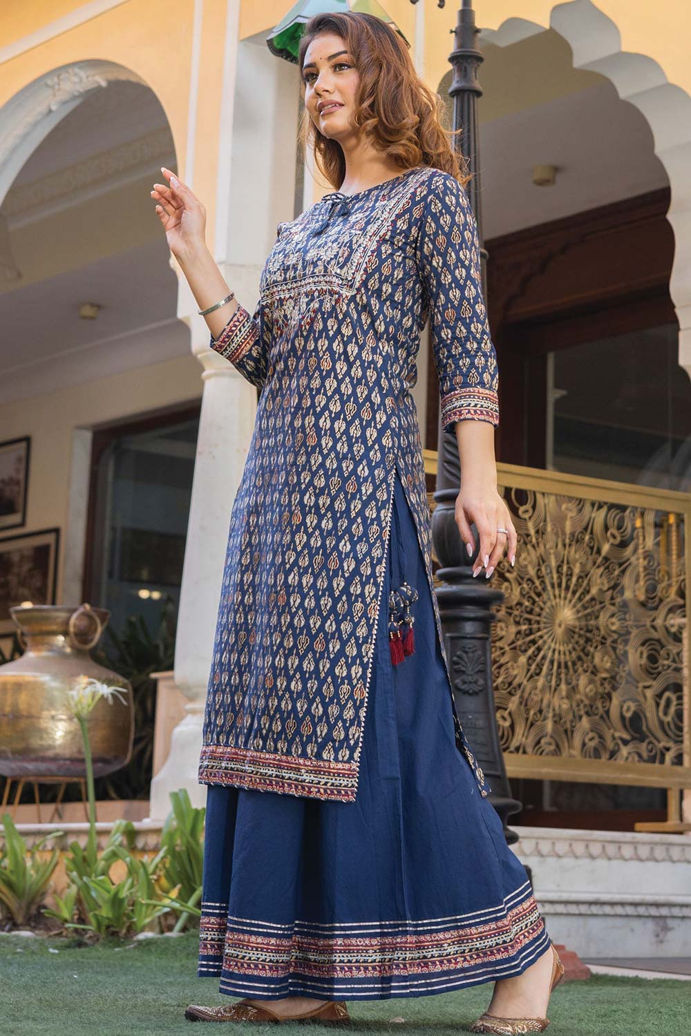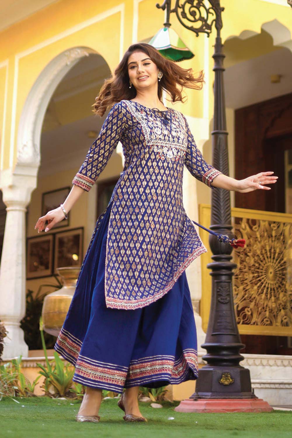 Indulge In Self Love With The Dressify Navy Blue Gota Patti Plazo Set, Best For Any Festive Occasion. It Has Beautiful Handwork Of Gota Patti Work On Front Neck With Flared Palazzo. Carry It With Minimal Accessory And You Are Ready To Shine.