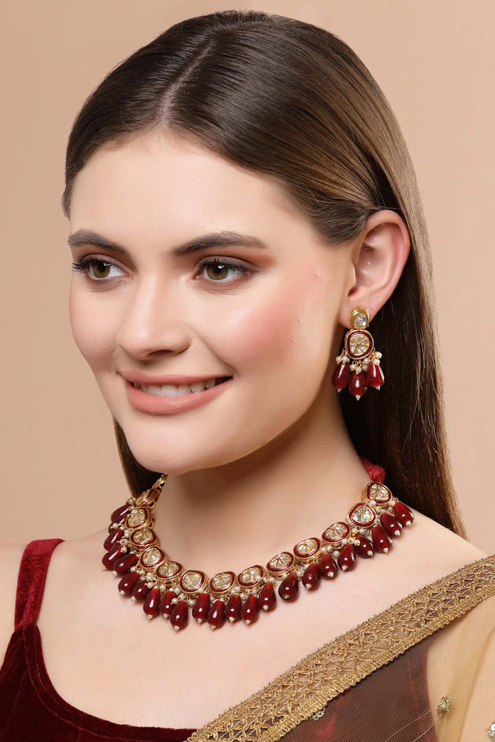 Red And Cream Gold-Plated Kundan And Pearls Jewelry Set