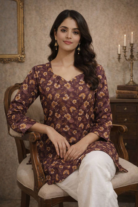 Wine Floral Printed Muslin Short Kurtis (ACA5578)