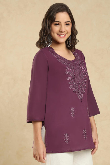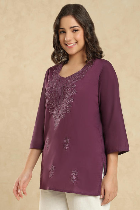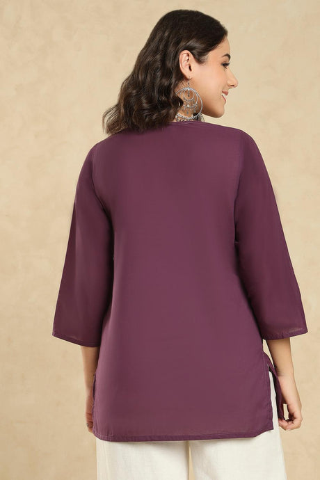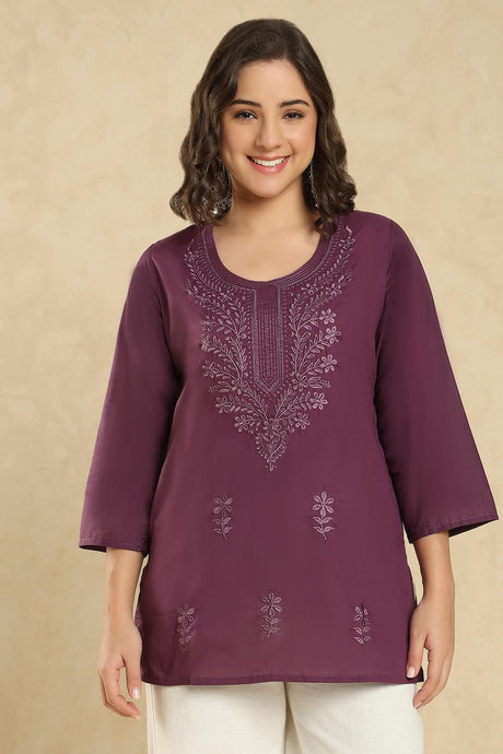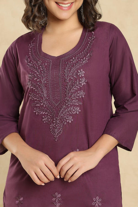 Wine Floral Embroidered Cotton Short Kurti (SSKT-006-WINE)