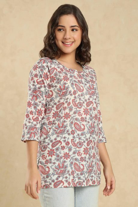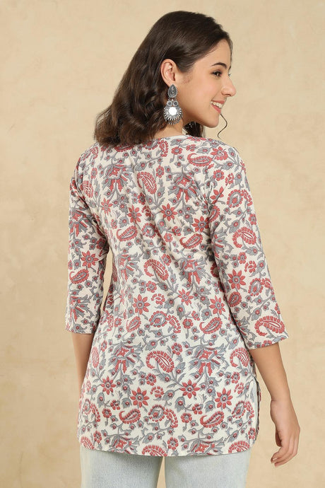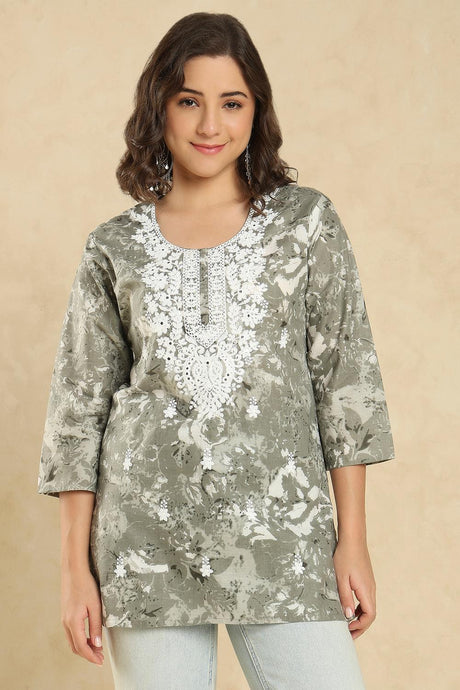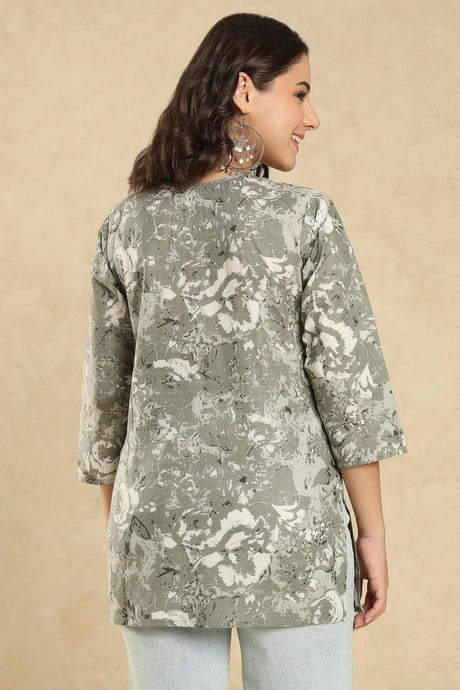 Grey Floral Printed Cotton Short Kurti (SSKT-009-GREY)