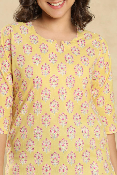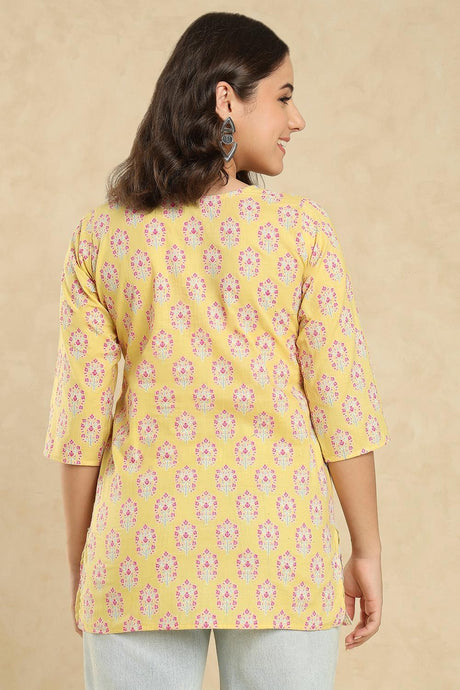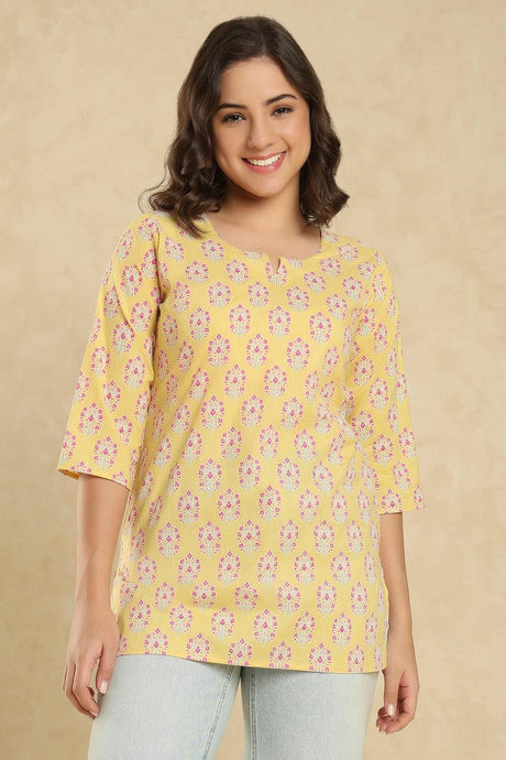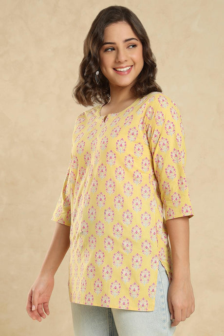Yellow Floral Printed Cotton Short Kurti (SSKT-010-YELW)