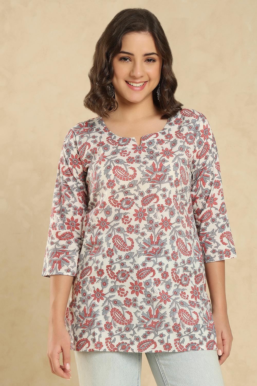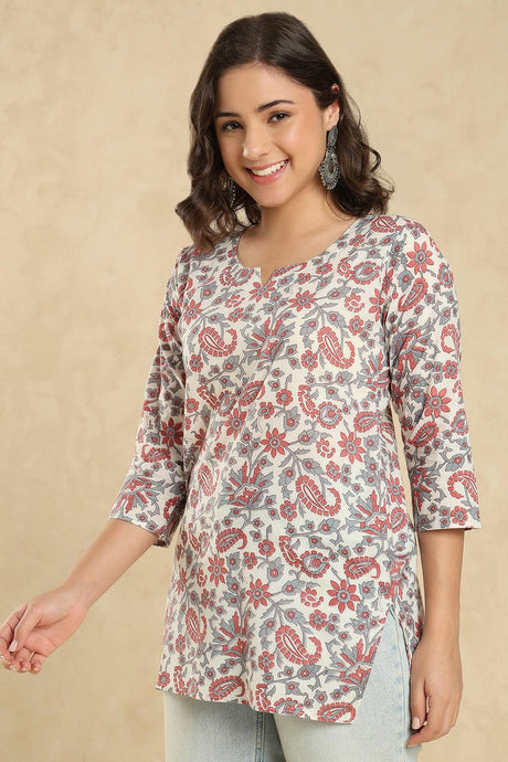 Beige Floral Printed Muslin Short Kurti (ACA5675)