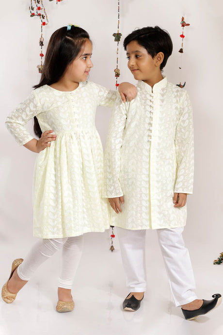 Boys Black And White Kurta Pajama Set & Girls Chikankari Cotton Kurta And Leggings Set