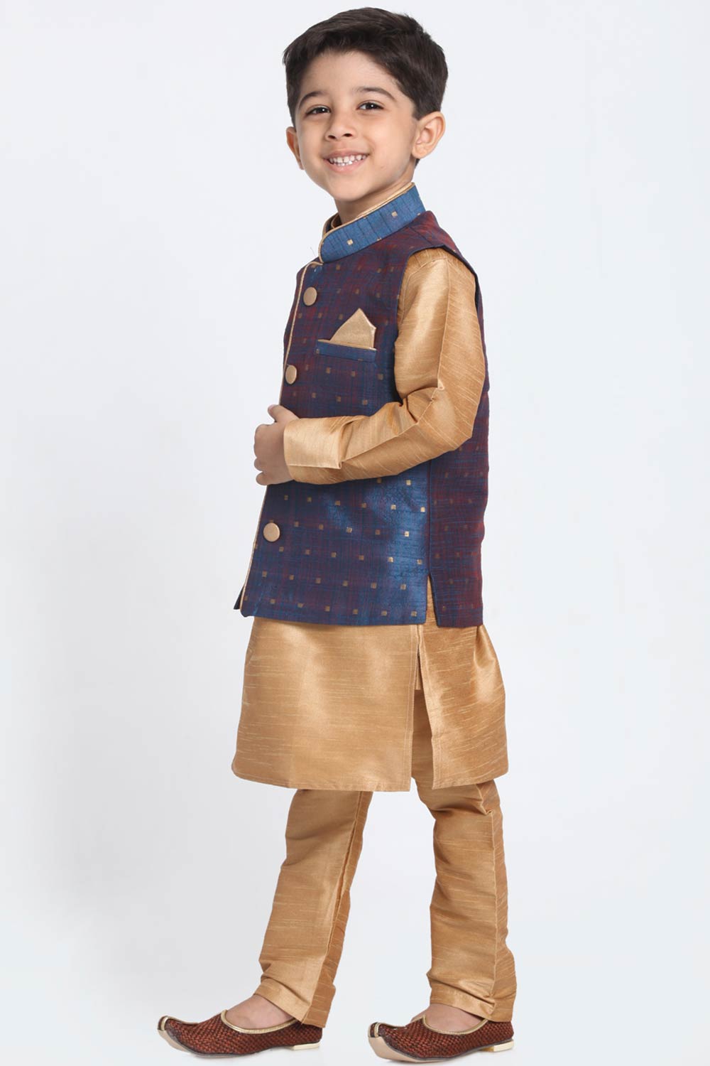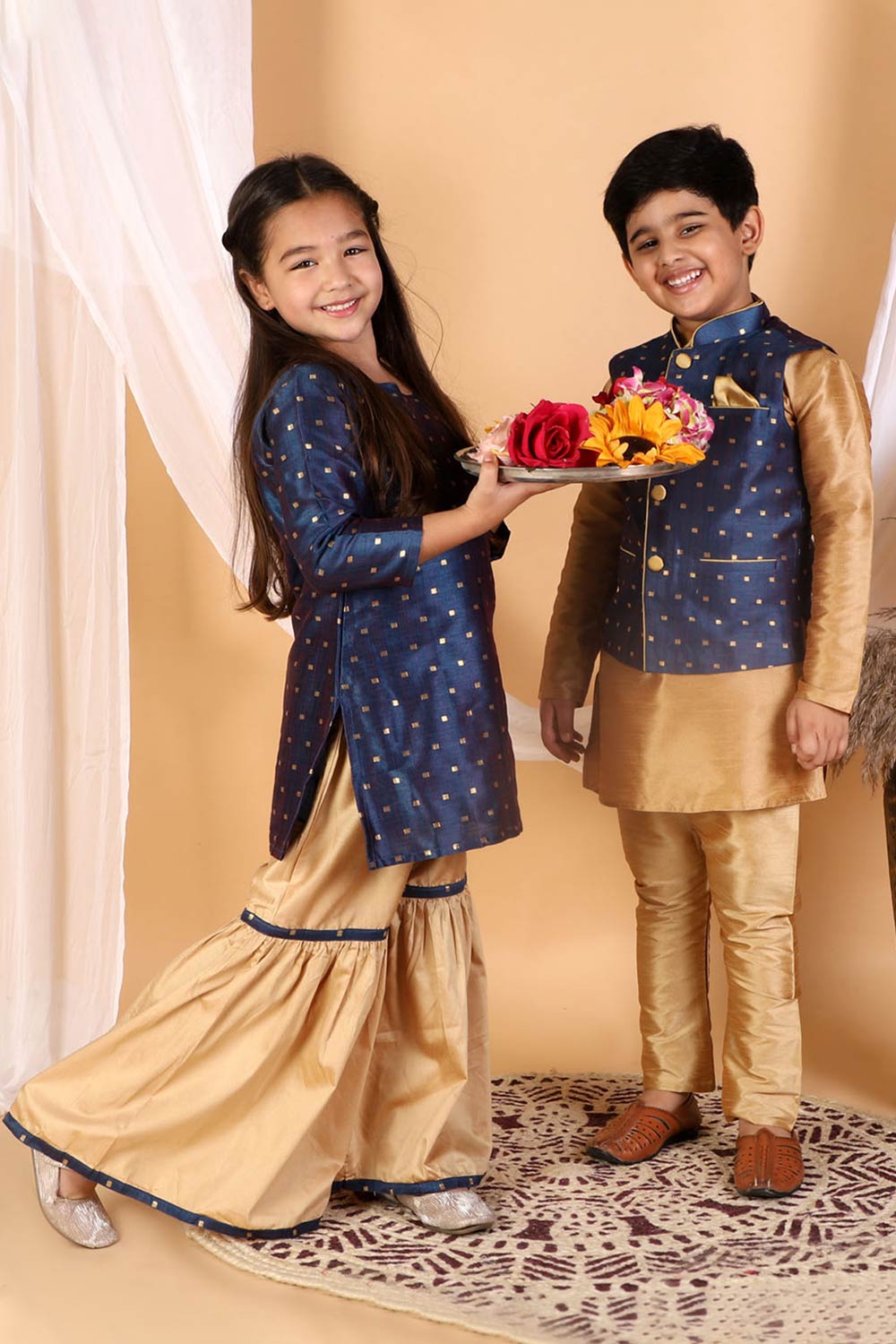 Boys Gold & Blue Silk Blend Jacket, Kurta And Pajama Set & Girls Jacquard Kurta With Sharara Set