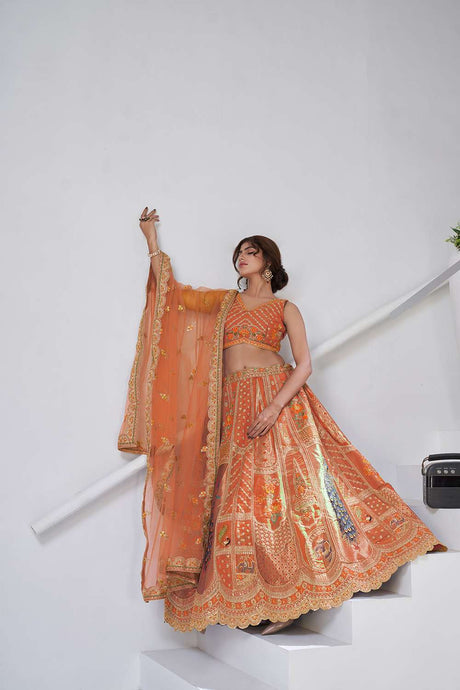 Sale price $470.00 USD Regular price $588.00Unit price /Unavailable Yellow Floral Embroidered Silk Lehenga