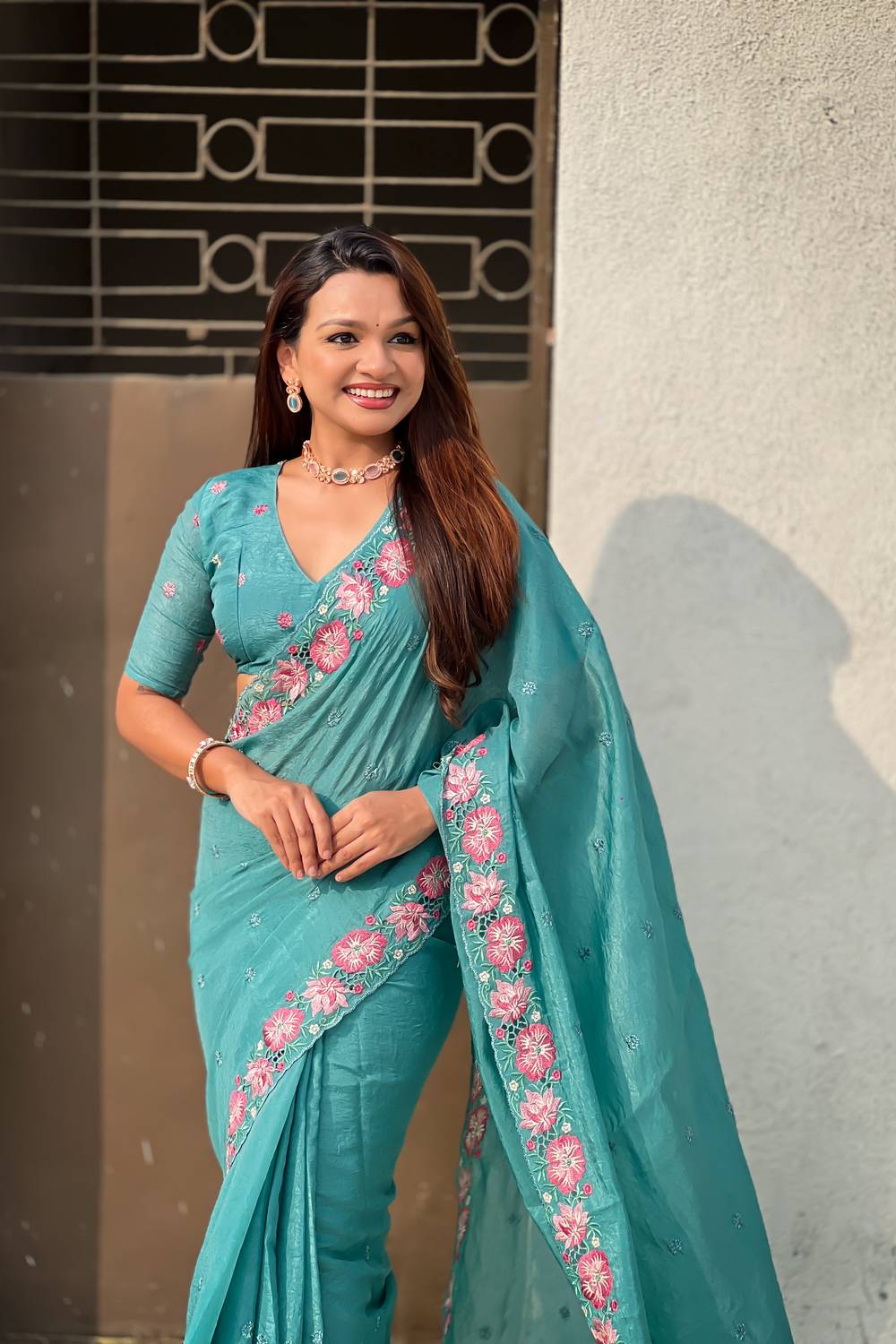 Elevate your wardrobe with our exquisite Saree a masterpiece crafted to add timeless elegance to your style. Made from Silk this saree offers a perfect mix of comfort and sophistication. Adorned with Floral Embroidered it showcases intricate craftsmanship that speaks volumes of tradition and artistry. Perfect for Festive, Wedding, Party this saree is a versatile addition to your collection, ensuring you stand out effortlessly. Pair it with elegant Jewelry, for a glamorous look. Add Clutches or Potli Bags and complete the ensemble with Wedges & Heels , making it a perfect choice for any event. Make a statement and embrace the elegance of Saree today