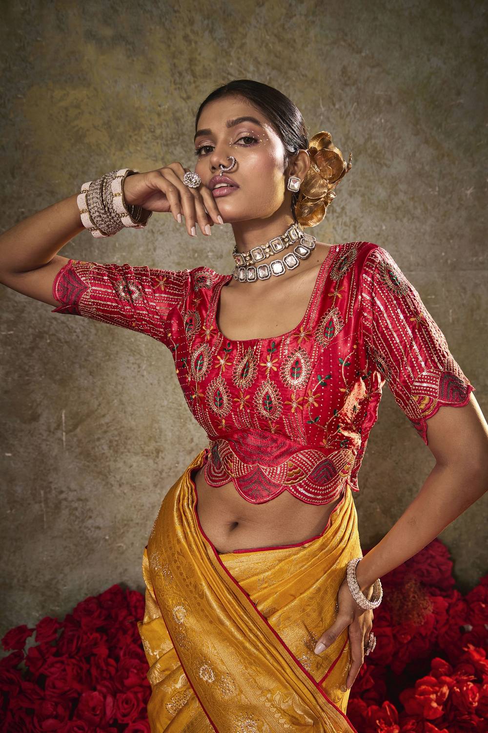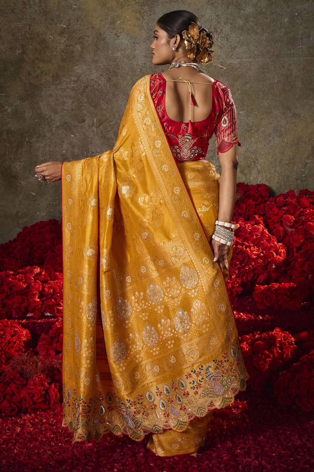 Elevate your wardrobe with our exquisite Saree a masterpiece crafted to add timeless elegance to your style. Made from Silk this saree offers a perfect mix of comfort and sophistication. Adorned with Woven it showcases intricate craftsmanship that speaks volumes of tradition and artistry. Perfect for Wedding, Reception, Sangeet this saree is a versatile addition to your collection, ensuring you stand out effortlessly. Pair it with elegant Jewelry, for a glamorous look. Add Clutches or Potli Bags and complete the ensemble with Wedges & Heels , making it a perfect choice for any event. Make a statement and embrace the elegance of Saree today