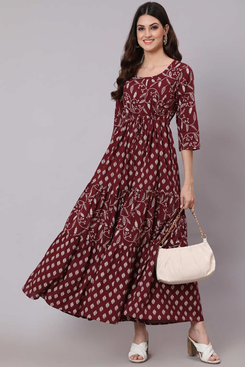 Burgundy Ethnic Cotton Floral Printed Flared Dress