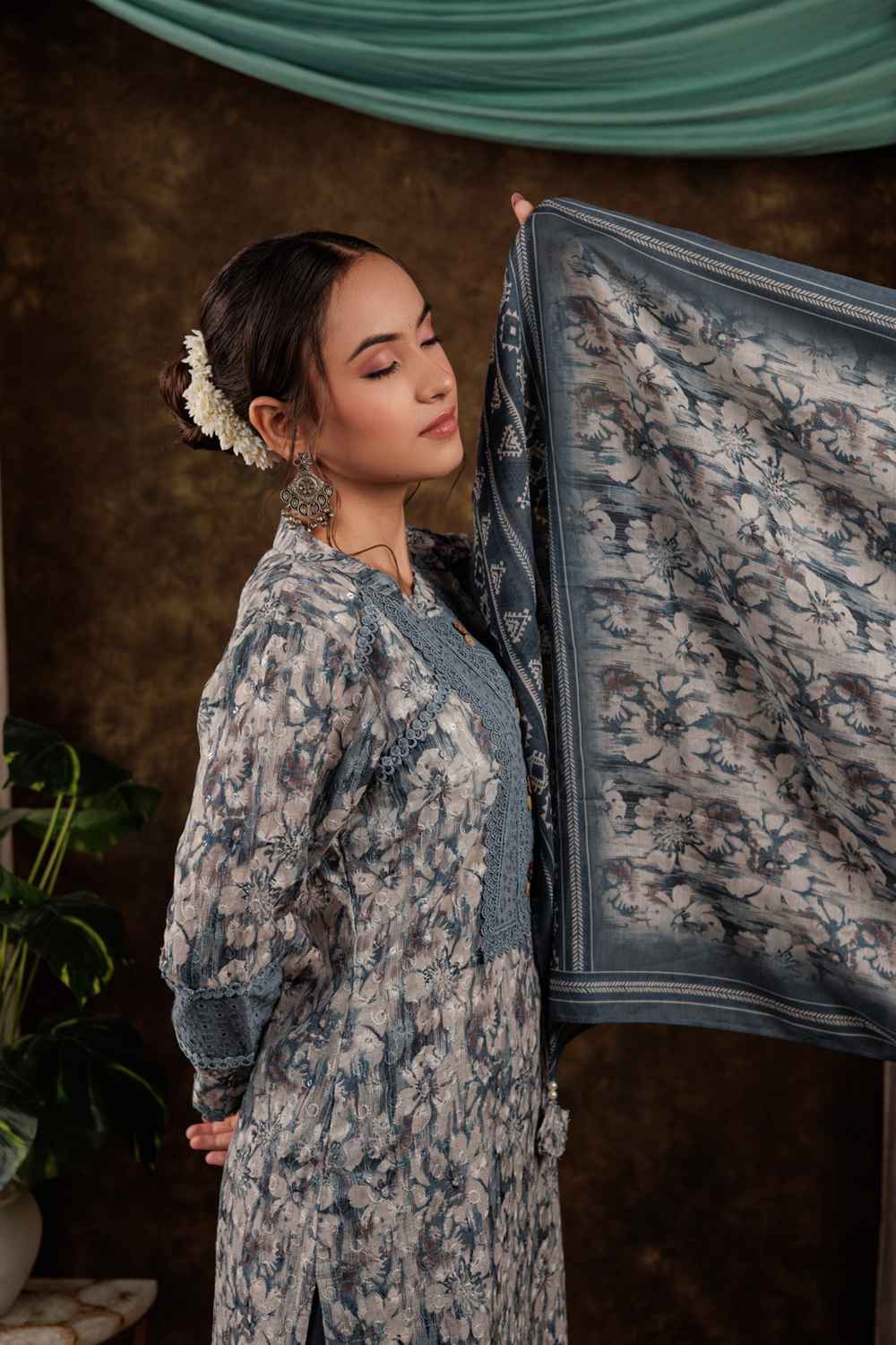 Grey Floral Print Beads and Stones Embossed Pure Cotton Kurti Pant Set