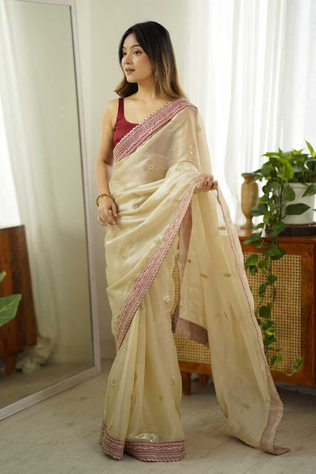 Beige Embroidered Tissue Saree