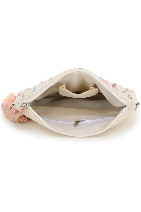 Kooky Beige And White Boohoo Quirky Embroidered Cotton Sling Bag