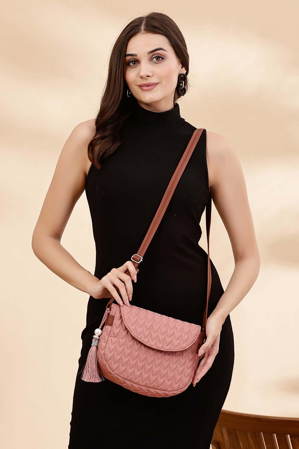 Coral And Tan Polyester And Vegan Leather Chevron Quilted Sling Bag