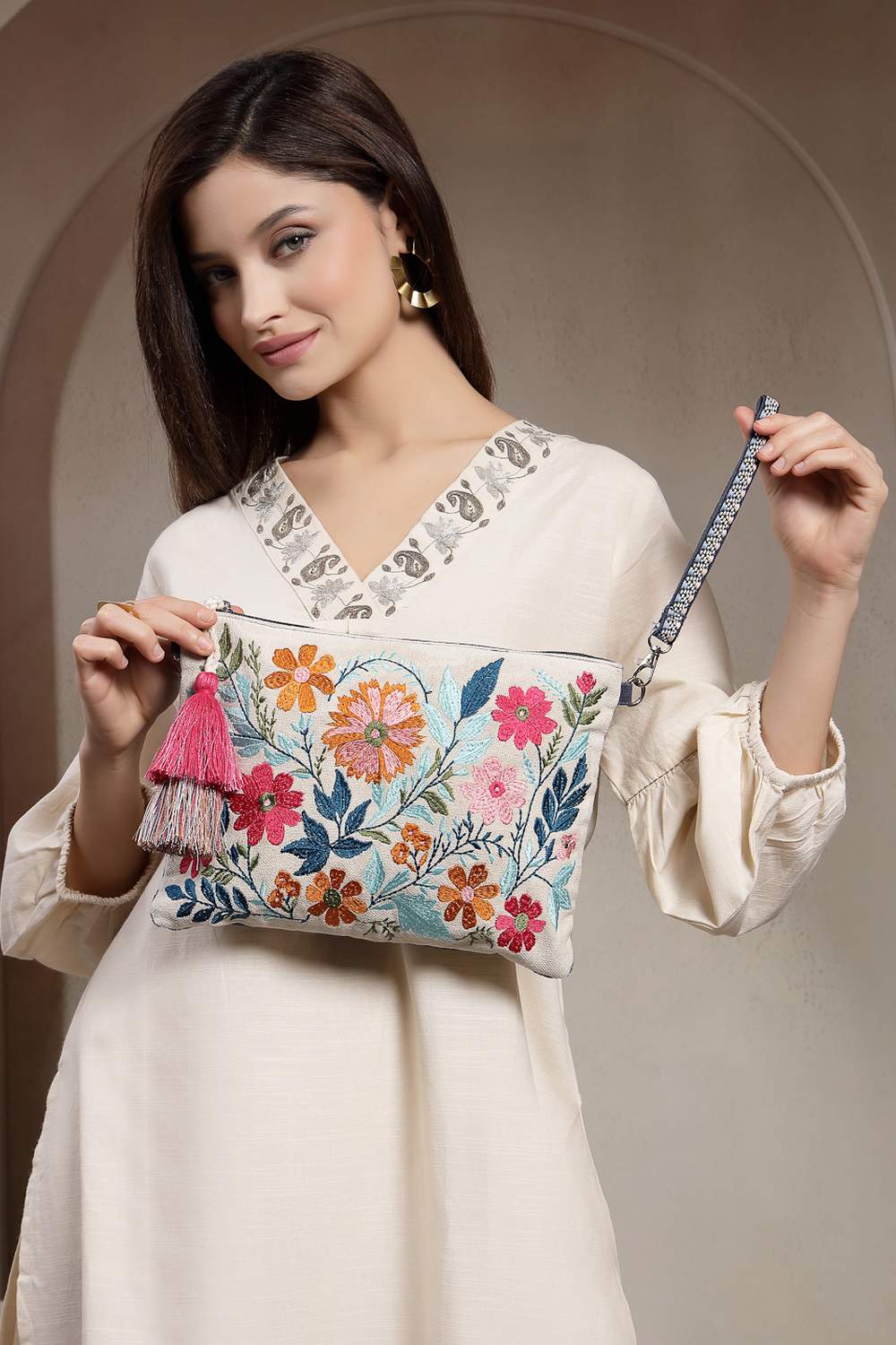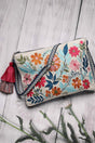 Off White Floral Embroidered Cotton Sling Bag